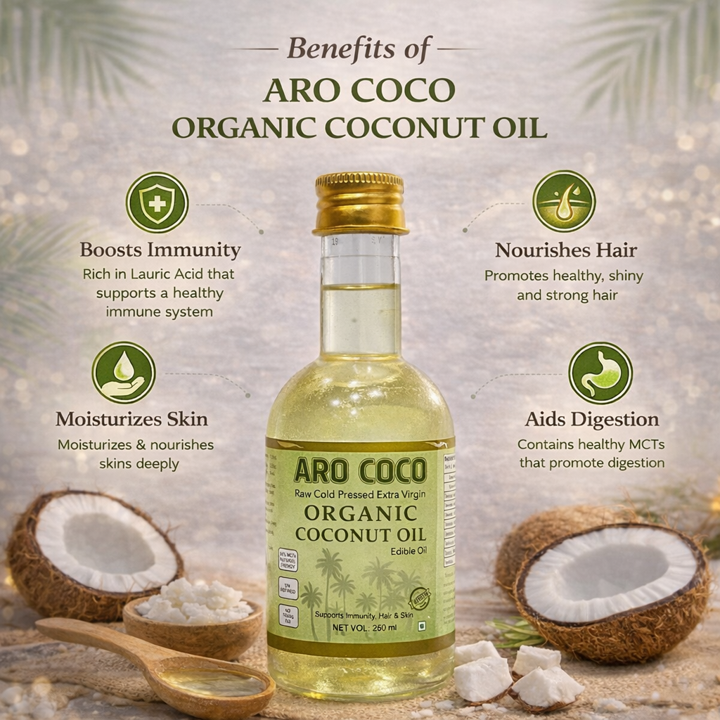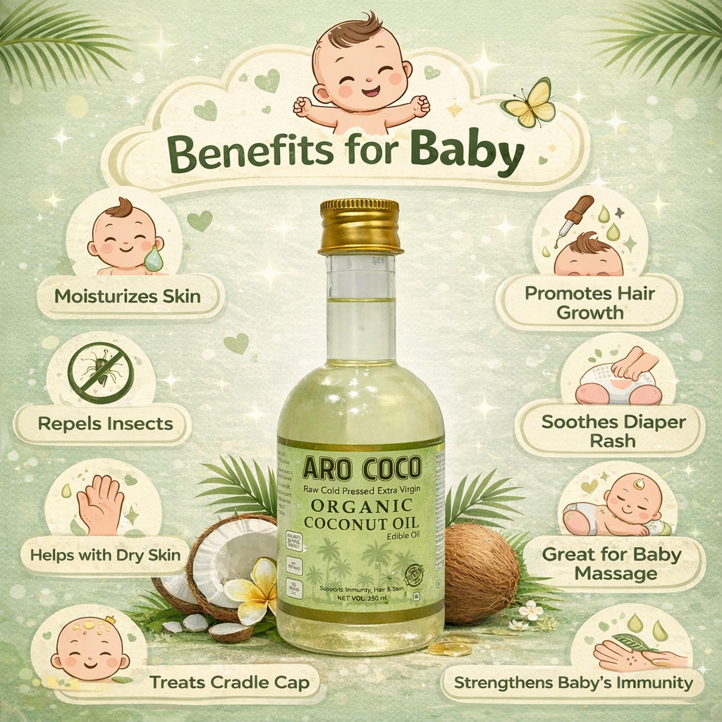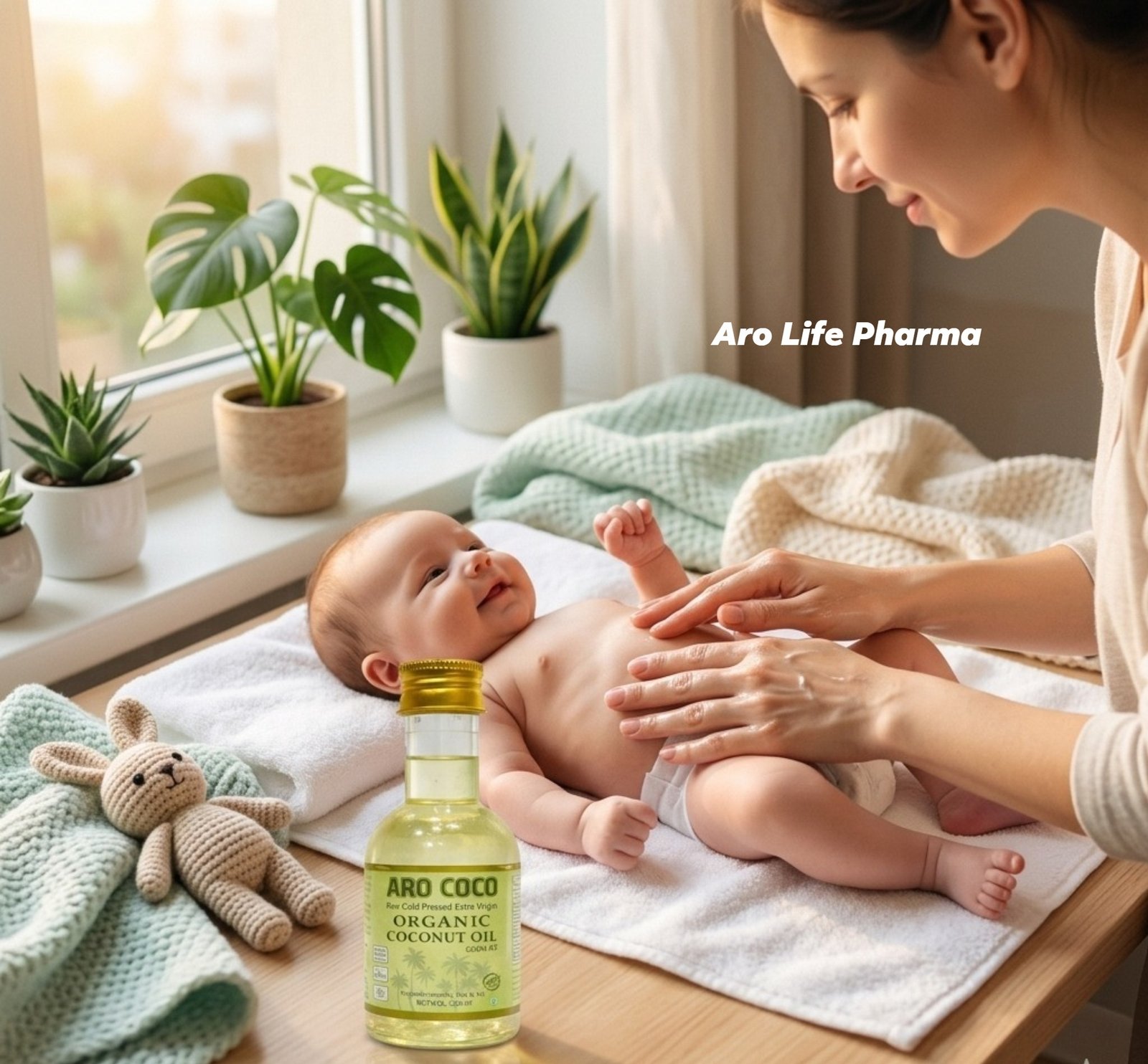 Give your baby the gentle care of nature with ARO COCO Baby Massage Oil, made from 100% pure cold pressed organic coconut oil. This extra virgin oil is specially designed for newborn and sensitive skin, providing deep moisturization while remaining light and non-sticky. Free from chemicals and additives, it helps keep your baby’s skin soft, smooth, and healthy. Perfect for daily baby massage, as well as hair and skin care for the whole family